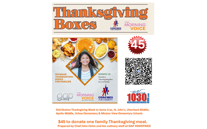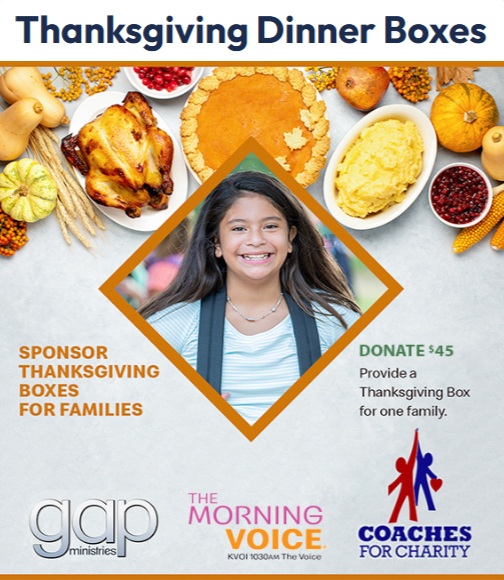Join 1030 The Voice’s The Morning Voice, Gap Ministries, and Coaches for Charity to support sponsoring Thanksgiving boxes for families this November!