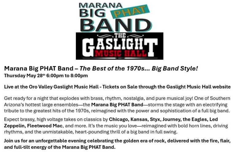 The Marana Big PHAT Band will be playing at the Oro Valley Gaslight Music Hall on Thursday May 28th from 6 – 8 pm.